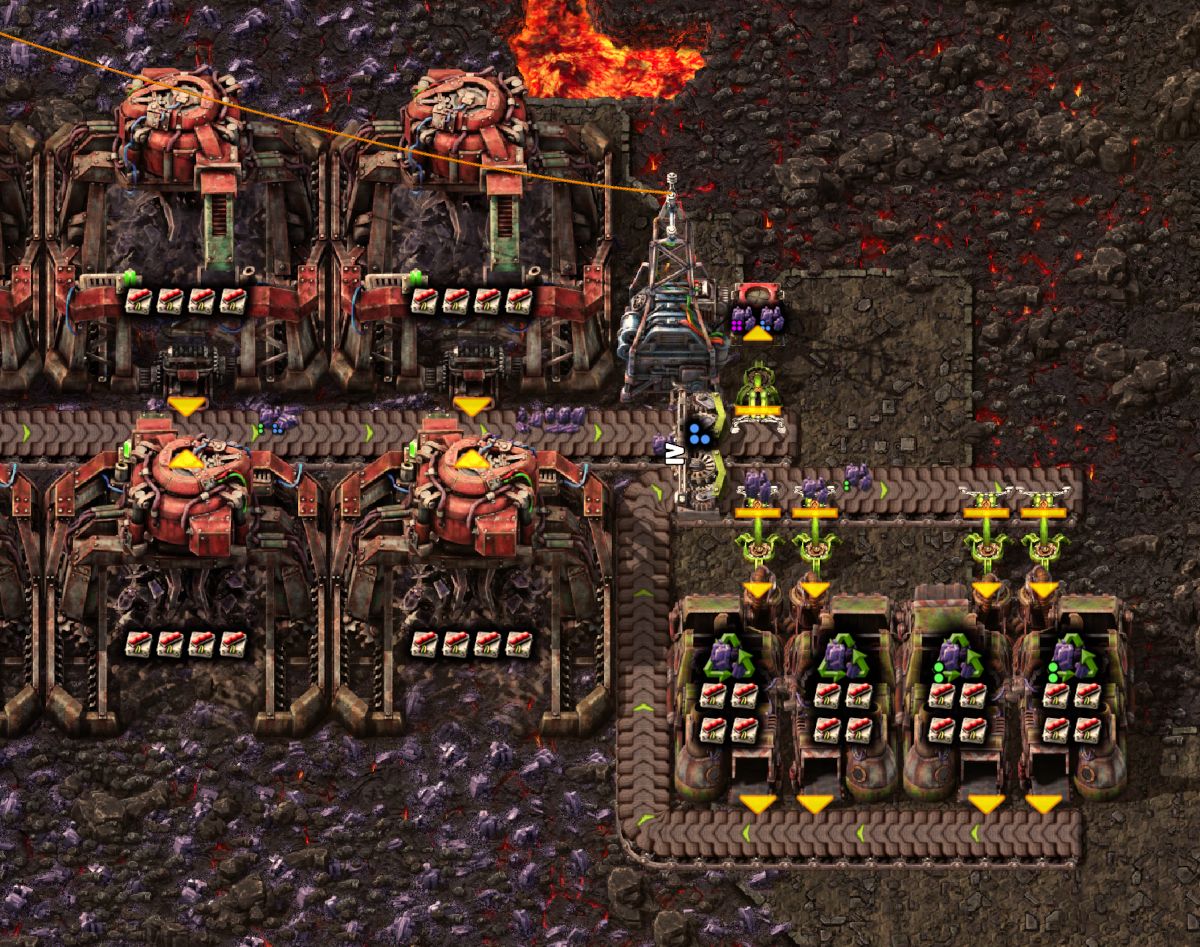 As “technologies” are unlocked in-game, Factorio offers many mechanisms to improve production. One of them is modules: crafting machines have a (limited) number of slots to accept different kinds of modules that affect its stats: speed modules make the machine run faster at the cost of more energy consumption, productivity modules increase yield from the same ingredients at the cost of speed and energy, etc.
