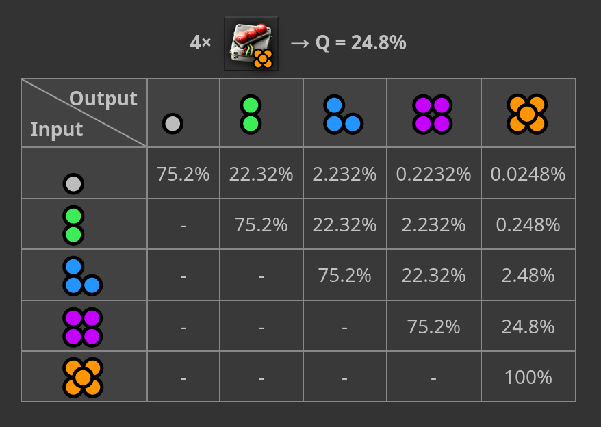 I was heavily inspired by Daniel Monteiro’s blog posts on quality math. Others have done similar work, including Konage and Factorio wiki contributors. As far as I can tell they all rely on iterative approximation, as opposed to the exact solution shown here.