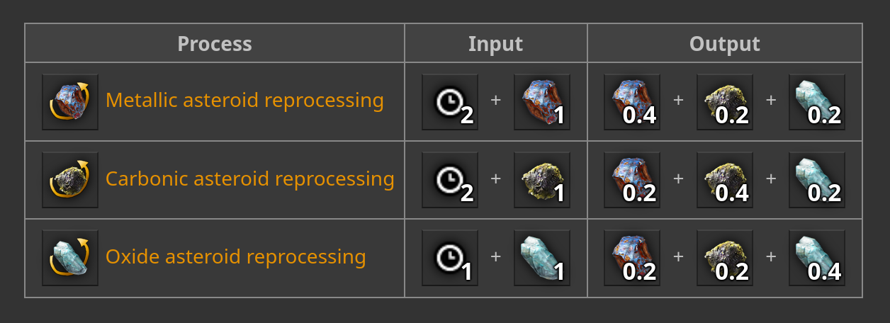 Three different types of chunks (metallic, carbonic, and oxide) yield different ressources and are more or less frequent in different regions of the solar system. Asteroid chunks can be “reprocessed” for a chance to get a different type (or nothing).