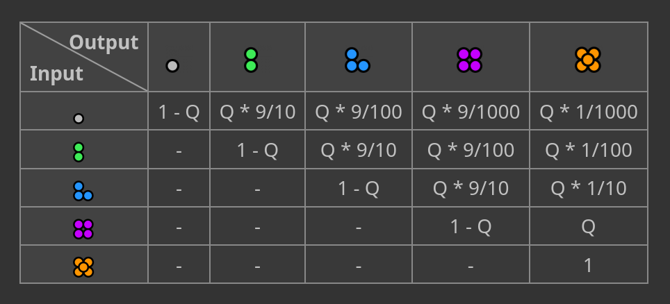 Let’s imagine we have a conveyor belt of ingredients (for example iron plates) of mixed quality tiers (⚀ normal, ⚁ uncommon, ⚂ rare, ⚃ epic, and ⚄ legendary), as well as enough assemblers to craft them all into some product (for example pipes) with a quality chance of 10%. A product of a given tier can come from ingredients of the same tier or lower, with probabilities we’ve established above: